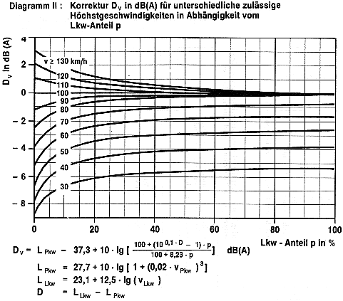 | Dv | Korrektur für unterschiedliche zulässige Höchstgeschwindigkeiten in Abhängigkeit vom Lkw-Anteil p nach Diagramm II. |