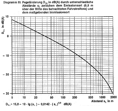 | DSL | Pegeländerung durch unterschiedliche Abstände SL zwischen dem Emissionsort (0,5 m über der Mitte des betrachteten Fahrstreifens) und dem maßgebenden Immissionsort ohne Boden- und Meteorologiedämpfung nach Diagramm III. Der maßgebende Immissionsort richtet sich nach den Umständen im Einzelfall; vor Gebäuden liegt er in Höhe der Geschoßdecke (0,2 m über der Fensteroberkante) des zu schützenden Raumes; bei Außenwohnbereichen liegt der Immissionsort 2 m über der Mitte der als Außenwohnbereich genutzten Fläche. |