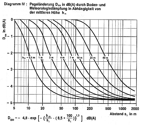 | DBM | Pegeländerung durch Boden- und Meteorologiedämpfung in Abhängigkeit von der mittleren Höhe hm nach Diagramm IV. Die mittlere Höhe hm ist der mittlere Abstand zwischen dem Grund und der Verbindungslinie zwischen Emissions- und Immissionsort. In ebenem Gelände ergibt sich hm als arithmetischer Mittelwert der Höhen des Emissionsortes und des Immissionsortes über Grund. |