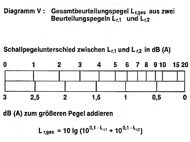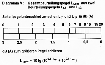 Die Beurteilungspegel mehrerer Gleise sind nach Diagramm V zum Gesamtbeurteilungspegel für den Schienenweg zusammenzufassen.