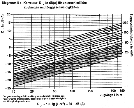 | Dl,v | Korrektur für die Zuglänge l in m und Geschwindigkeit v in km/h nach Diagramm II. Sind die tatsächlichen Längen und Geschwindigkeiten nicht bekannt, können 1 und v Tabelle B entnommen werden. |
