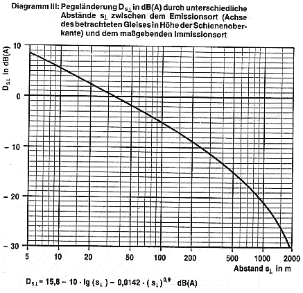 | DSL | Pegeländerung durch unterschiedliche Abstände SL zwischen dem Emissionsort (Achse des betrachteten Gleises in Höhe der Schienenoberkante) und dem maßgebenden Immissionsort ohne Boden- und Meteorologiedämpfung nach Diagramm III. Der maßgebende Immissionsort richtet sich nach den Umständen im Einzelfall; vor Gebäuden liegt er in Höhe der Geschoßdecke (0,2 m über der Fensteroberkante) des zu schützenden Raumes; bei Außenwohnbereichen liegt der Immissionsort 2 m über der Mitte der als Außenwohnbereich genutzten Fläche. |